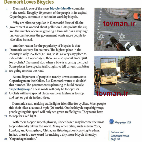 About ۲۰ percent of people in nearby towns commute to Copenhagen on their bikes. But Denmark wants to double this number. The government is planning to build bicycle "superhighways:' These roads will only be for cyclists. Cyclists will have special places on these highways to stop and rest or put air in their tires.
