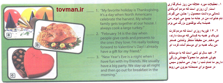 درس ۸ اینترچنج ۲ درباره جشنواره ها و تعطیلات مختلف در کشورهای مختلف است. گرامر این درس درخصوص جمله واره ها در زبان انگلیسی است. در ابتدا با تعدادی از این جشنواره ها و تعطیلات آشنا می شویم:
