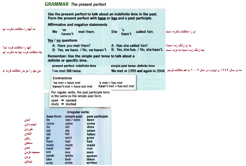 گرامر: حال کامل (ماضي نقلي) زماني بکار مي رود که عملي در گذشته نامعين انجام شده است و اثر آن تاکنون باقي مانده است. لازم به ذکر است که اگر عملي در گذشته معين مثلا ديروز يا سال ۱۹۹۹ انجام شده باشد بايد گذشته ساده را بکار برد. فرمول زمان حال کامل بصورت زير است: